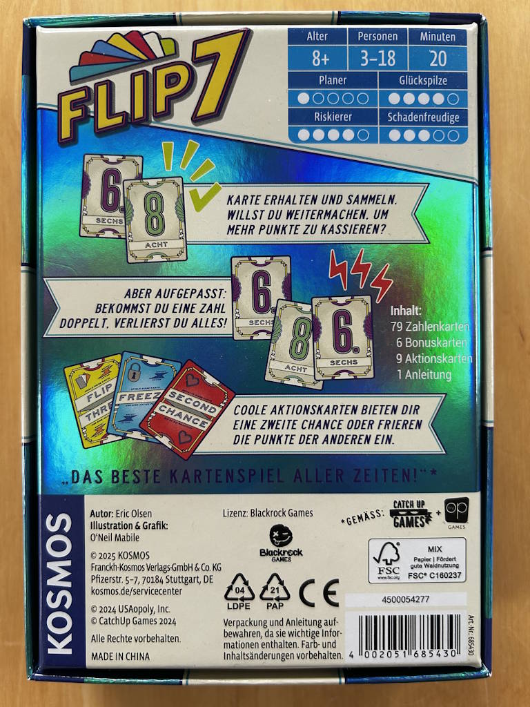 Flip 7 ist für mich nach kurzer Zeit schon eines der besten Kartenspiele geworden. Es ist leicht zugänglich, spielt sich flott und sorgt für jede Menge Spielspaß. Besonders gefällt mir, dass es völlig unabhängig vom Spielertyp funktioniert – egal ob mit Gelegenheitsspielern oder Vielspielern: Alle steigen schnell ein und wollen dranbleiben.